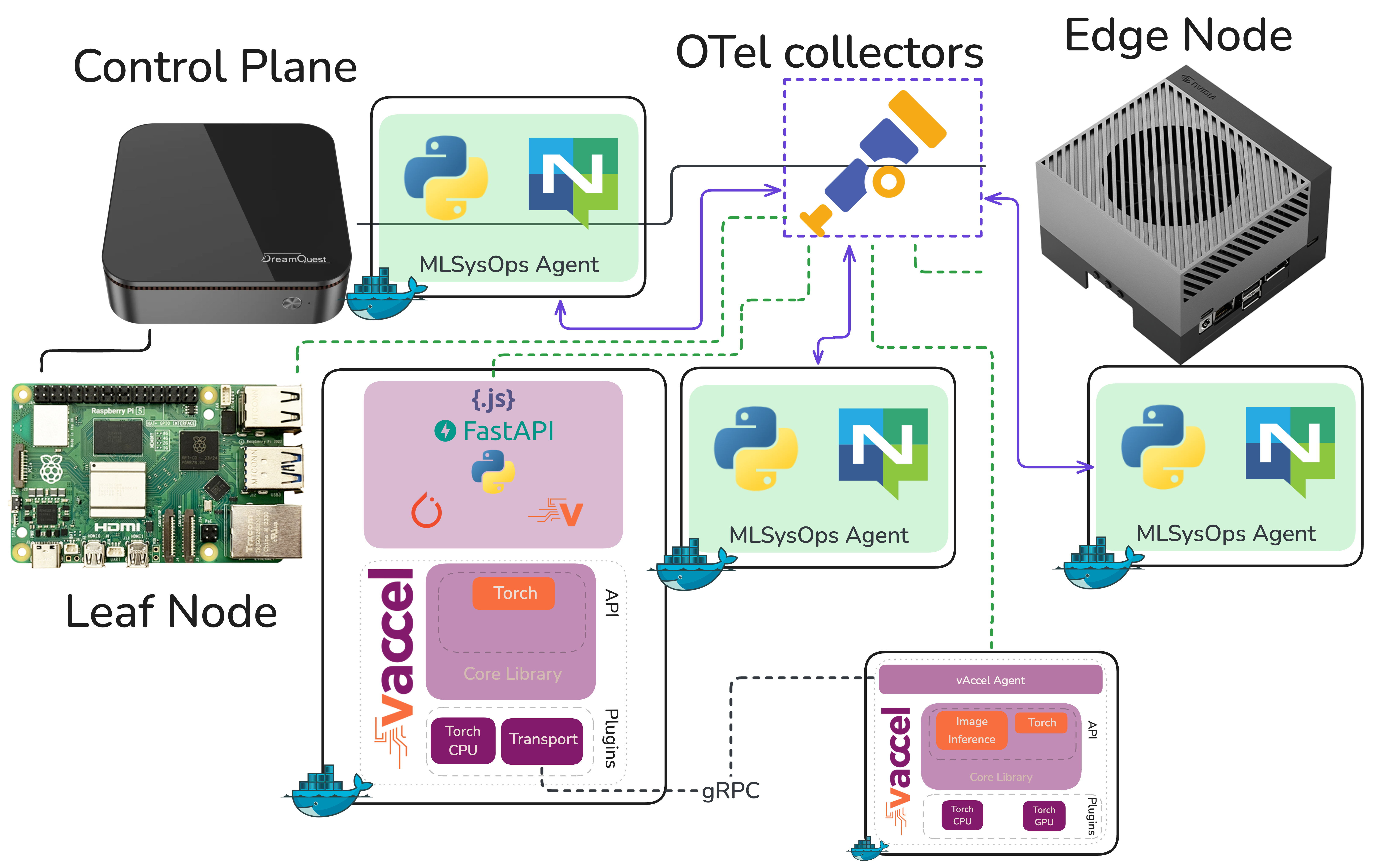 The demo flow goes like this: the object detection workload deploys and runs locally on the Raspberry Pi. As the Pi starts to struggle, frame rate drops, inference latency climbs, the MLSysOps agents picks this up through telemetry and transparently switches the vAccel backend to point at the Jetson AGX Orin. Suddenly the workload is offloaded to serious GPU hardware, real-time object detection kicks-in, and the policy change is the only thing that made it happen. No redeployment, no manual intervention. That’s the story we want to tell.